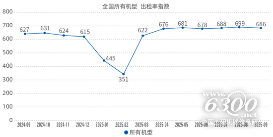 2025年9月升降工作平台出租率指数为686点,环比微降1.9%,同比上涨9.4%。总体看9月份各机型环比出租率指数涨跌各半,其中20~24m机型出租率指数环比涨幅最大,达到5.3%,40m以上机型环比降幅最大,达到11.4%。2025年9月出租率指数同比均处于普涨态势,20~35m机型的涨幅都超过了两位数 ,26~28m机型涨幅最大,达到19.4%,40m以上机型涨幅最小仅为0.3%,基本处于持平状态。(出租率是以台天数为基准进行计算,100%出租率对应1000点。)