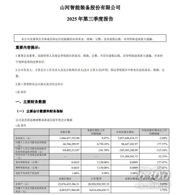 近日,山河智能发布2025年三季报显示,公司前三季实现营业收入50.57亿元,同比下滑2.08%;归母净利润9664.72万元,同比增长177.57%;扣非归母净利润-1.05亿元。