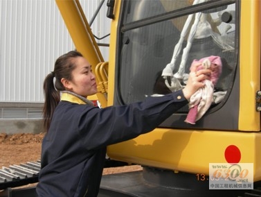 营销部裴维薇在仔细擦拭即将装车的挖掘机