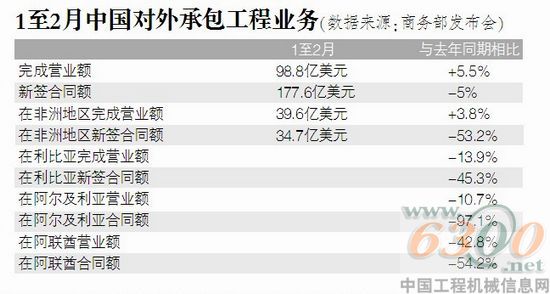 姚坚昨日透露,作为中国对外承包工程业务的主要市场之一,西亚北非地区近期的政局动荡,对中国承包工程产生了一定影响。今年1-2月,中国在非洲地区承包工程业务新签合同额34.7亿美元,同比减少53.2%。
