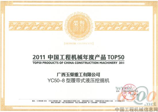 3月27日,在北京举行的“2011中国工程机械年度产品TOP50”颁奖盛典上,玉柴重工产品YC50-8履带式液压挖掘机喜获2011中国工程机械年度产品TOP50殊荣。