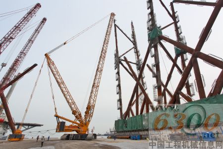 4月17日,在山东蓬莱海洋石油平台建造工程中,徐工第2台千吨级履带起重机与德马格5台履带起重机联合作业,在载荷90%的情况下带载行走,顺利将高达96米、重达650余吨的深海导管,吊接到200多米远的主结构件上,成功挑战海洋工程施工领域极限。
