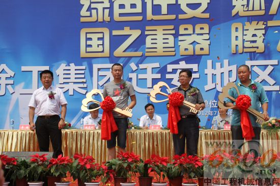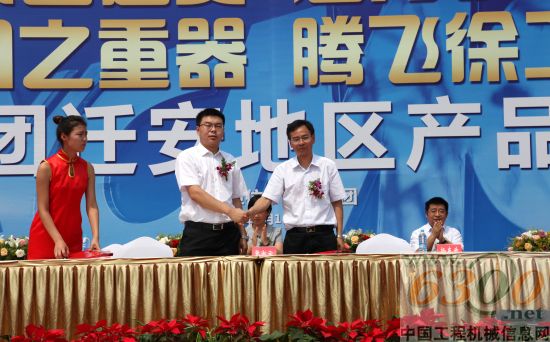 会上,迁安市民营企业家代表郑宝海与徐工集团总经理助理、徐工挖机总经理李宗签订了战略合作协议,徐工机械副总裁、徐工科技总经理杨东升向迁安市通宇公路建筑有限公司总经理宋锡元、唐山市蓝天海实业有限公司副总经理徐子永,河北钢铁集团矿业有限公司棒磨山铁矿副矿长张志平赠送代表诚信与荣誉的产品金钥匙。