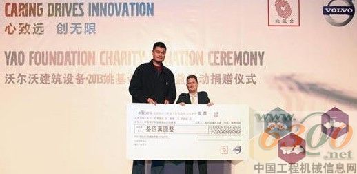 2012年11月26日,在上海金桥举行的沃尔沃建筑设备“bauma China 2012前瞻夜”晚宴上,沃尔沃建筑设备正式宣布向“2013姚基金希望小学篮球”公益活动项目捐赠300万元人民币,让中国贫困青少年有机会参与篮球运动,在享受篮球运动快乐的同时,感受体育精神,并帮助其身心发展。同时,沃尔沃建筑设备L105装载机全球首发仪式同步举行,中国青少年发展基金会冯敏慧部长、姚基金创始人姚明、沃尔沃建筑设备全球总裁Pat Olney先生以及公司高层出席此次仪式。
