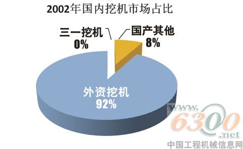 2002年,全国挖掘机销量为19709台,其中国产品牌1577台,市场占有率仅8%,此时的三一挖掘机市场占有率为零。