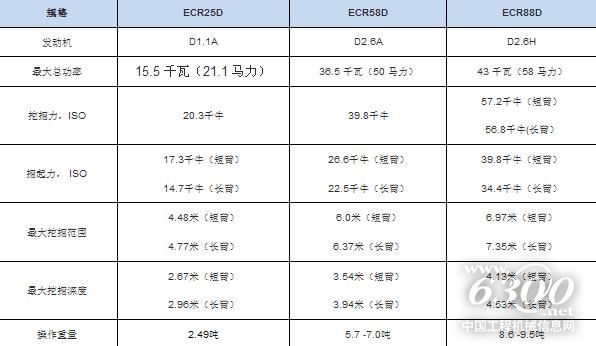 ECR25D型挖掘机在欧洲、中东、非洲和北美地区销售。ECR58D型挖掘机(Stage IIIA级)在欧洲和亚洲地区销售。ECR58D型挖掘机(Tier 4f级)在北美地区销售。ECR88D型挖掘机在欧洲和北美地区销售。