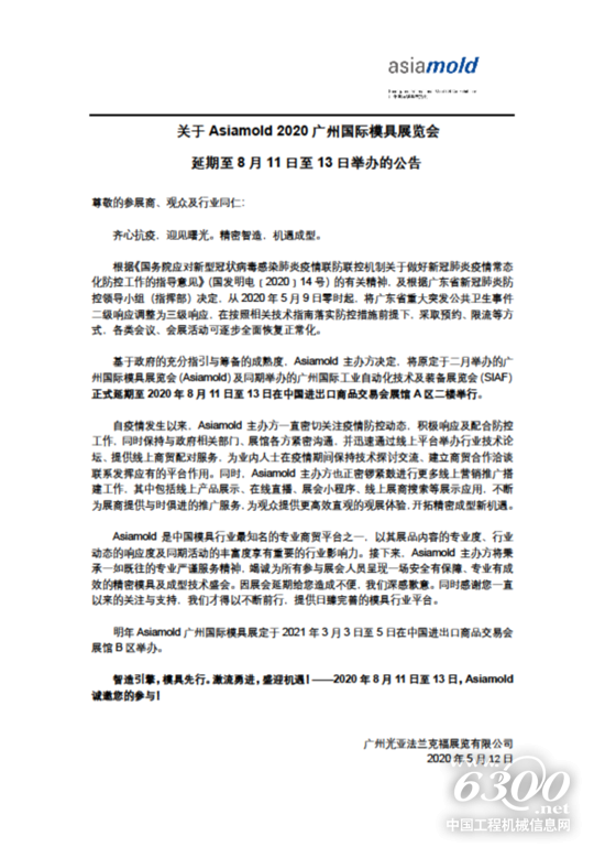广州光亚法兰克福展览有限公司董事长杜承华先生代表主办方表示:“ 在与业内的合作伙伴协商后,我们很高兴为SIAF和Asiamold确立了新的展会日期。我们相信现在是一个重要时机,通过SIAF和Asiamold,我们将致力为工业自动化技术及模具领域提供有效的平台,从而帮助行业复苏。”他续说:“我们也会竭尽所能,为所有业内人士提供一个安全的展会环境。我们稍后将会公布更多相关的防疫措施。”