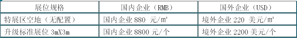 ★展位配置:企业名称标准楣标、一张洽谈桌、两把座椅、两盏射灯、一个250W/220V电源插座(不含照明及机械用电)、地毯、纸篓。