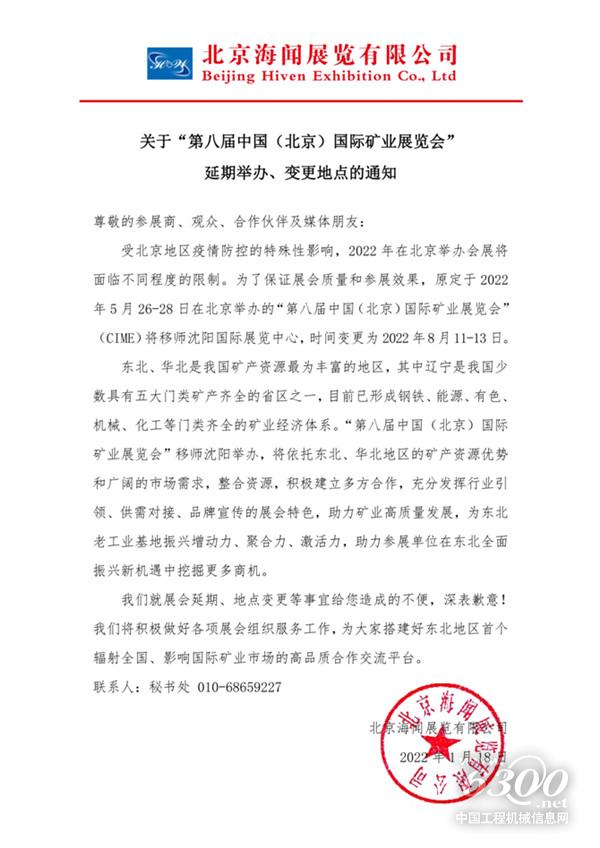 附:关于“第八届中国(北京)国际矿业展览会”延期举办、变更地点的通知