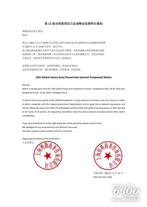 原定于 2022 年 11 月 29-30 日在中国上海举办的第 12 届全球重型动力总成峰会将延期至 2022 年 12 月 19-20 日举行,地点不变。