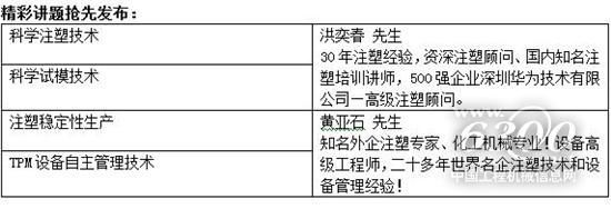 展会第三天还将举办两场特别的培训讲座,主题分别为“科学注塑成形技术”及“ 模塑车间的TPM设备管理方法”。前者将介绍科学注塑的基本原理和功效,后者将解释TPM管理方法的目的和优势。两场讲座将由在模具行业拥有超过30年经验的行业专家主持,让有兴趣人士了解更多模具行业的技术和解决方案。