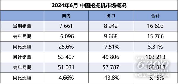 据中国工程机械工业协会对挖掘机主要制造企业统计,2024年6月销售各类挖掘机16603台,同比增长5.31%,其中国内7661台,同比增长25.6%;出口8942台,同比下降7.51%。